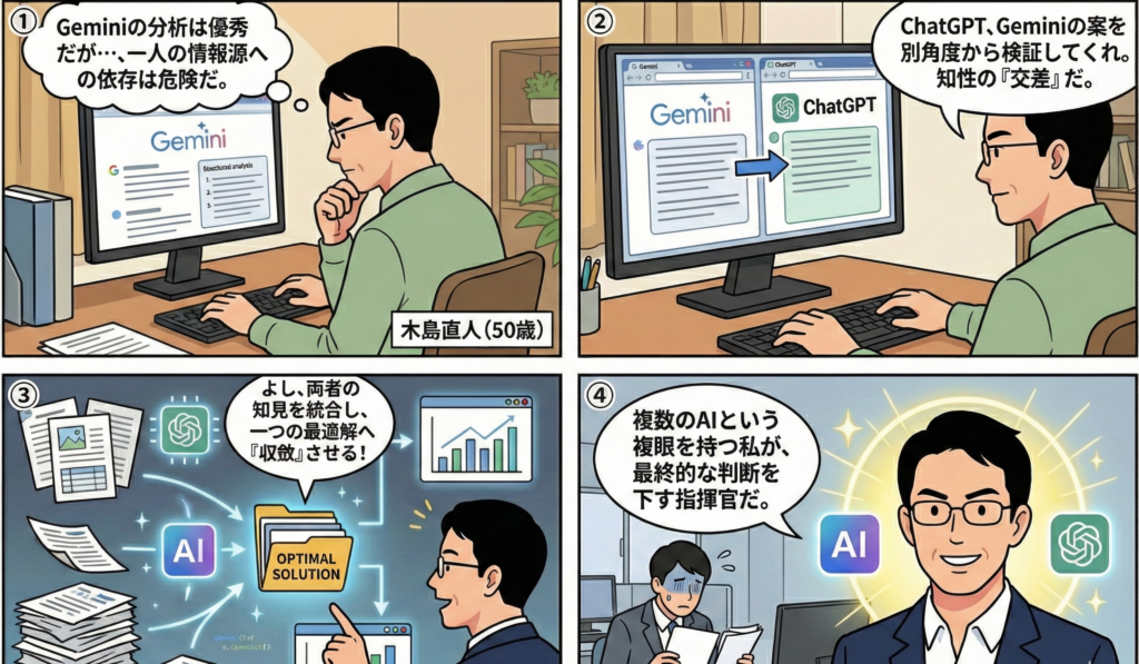 「AIは若者のもの」——そう思っていませんか? 実は、逆です。AIは自然言語で動きます。必要なのは指先の速さではなく、「何をさせるか」を定義する「問いの質」と、答えを見抜く「目利き力」です。主人公・木島直人、50歳。窓際部署の元ゼネラリストが、AIを「部下として指揮」することで逆転していく実践ストーリーです。