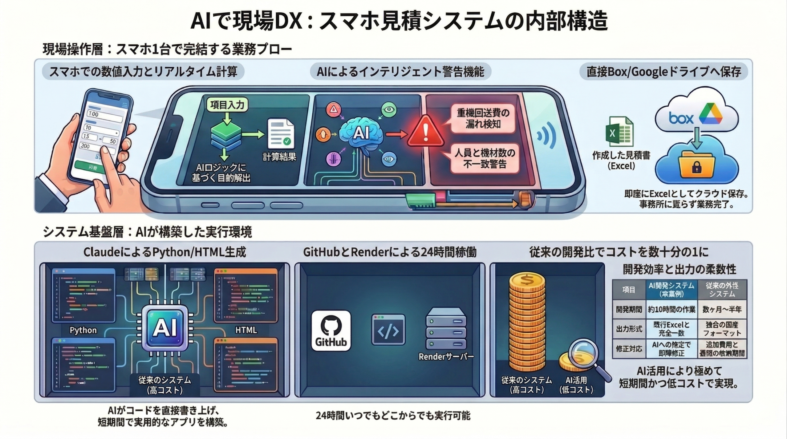 下段は、私が10時間で組み上げた裏側です。Claude CodeによるPython/HTML生成でコードを書き、GitHubとRenderによる24時間稼働環境にデプロイしました。社員4名が同じリンクから24時間いつでも、どこからでも使えます。