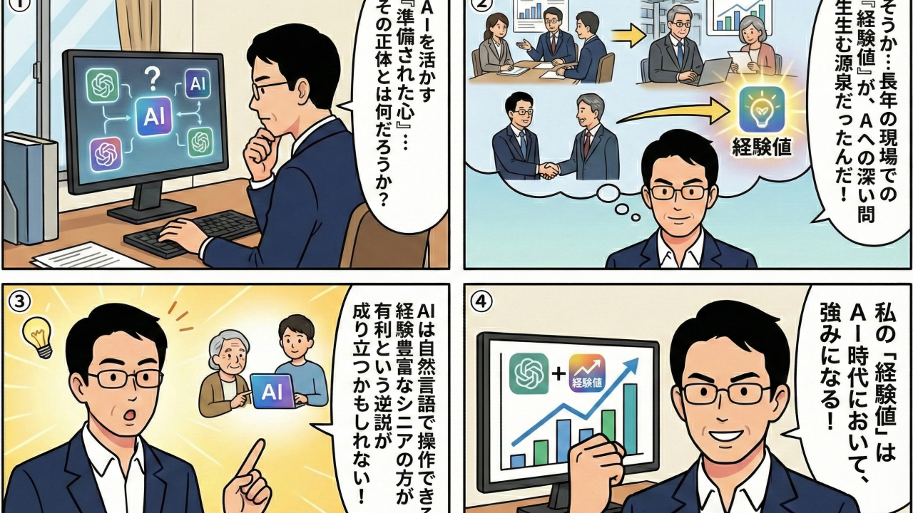 長年の専門知識と経験値。それこそが、AIを最大限に活用するための「準備された心」を構成する。若い世代には、まだその蓄積がない。彼らがこれから十年、二十年かけて積み上げていくものを、シニア層はすでに持っている。