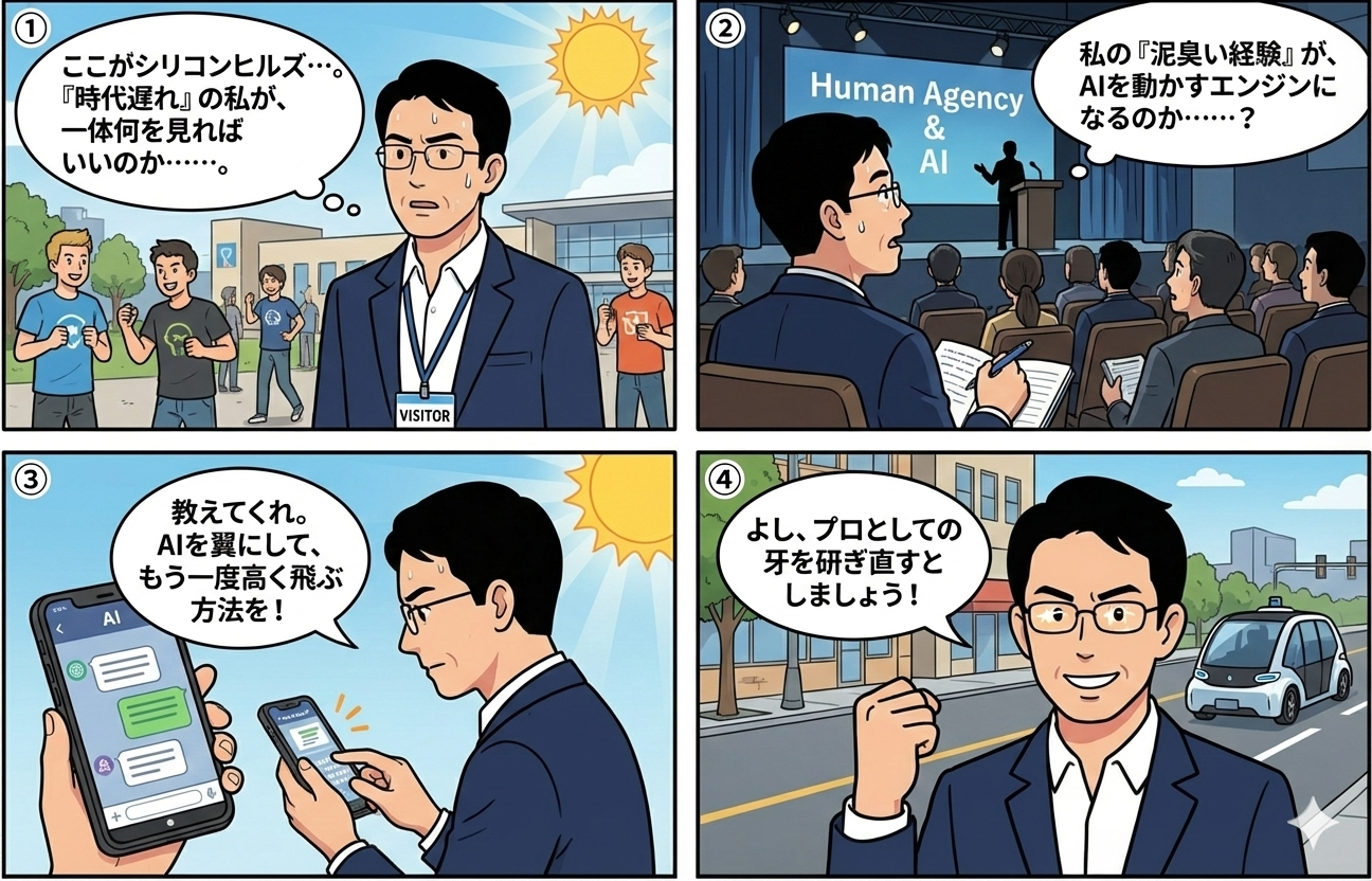 作者からのメッセージ 第2回では、テキサスの強烈な陽光と、街を走るロボタクシーという現実を目の当たりにし、木島が「AIは俺の武器になる」と確信する瞬間を描きました。組織の論理に閉じ込められていた人間が、テクノロジーを通じて自らの「主体性」を取り戻していく。その覚醒の第一歩です。