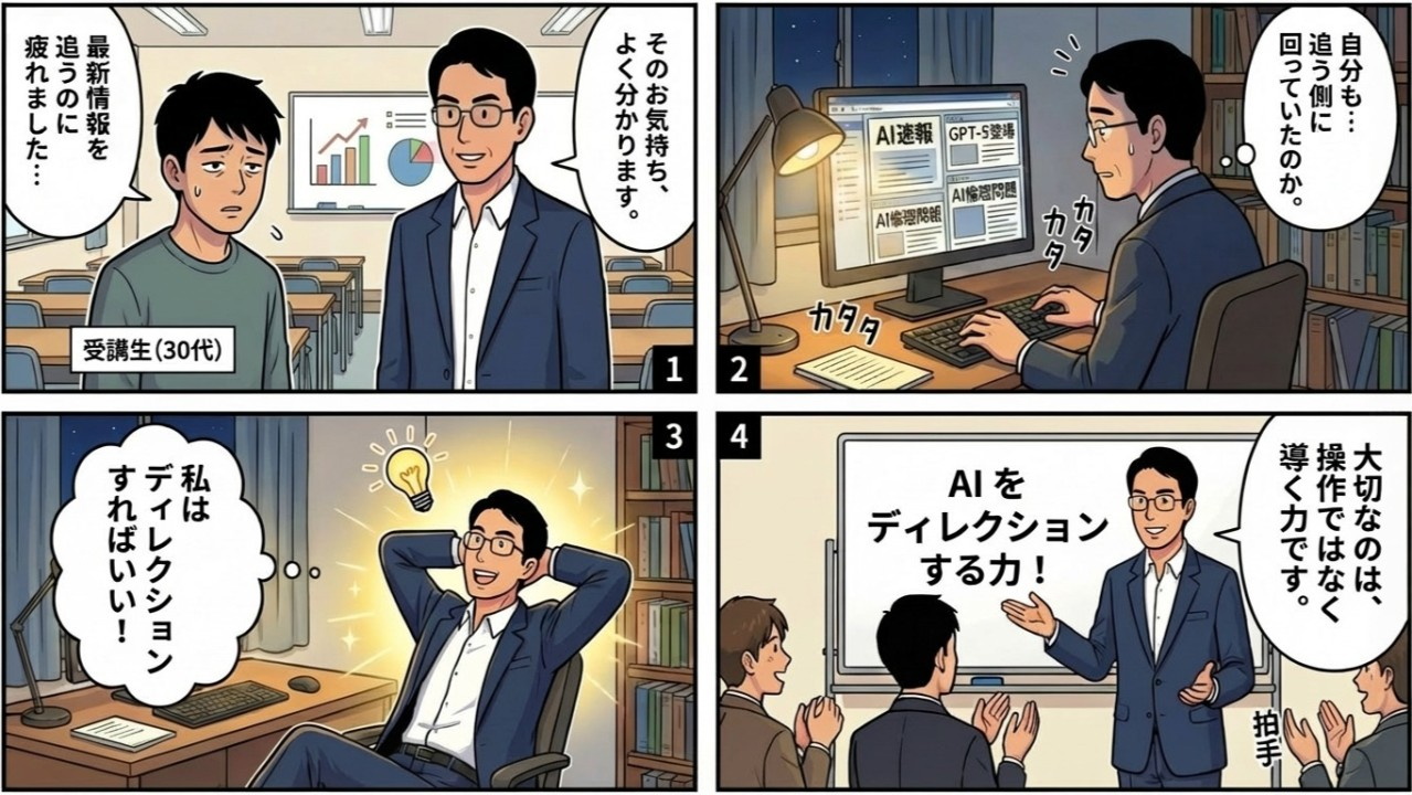 - 軸を持てば、変化は脅威ではなくなる: ディレクション力という軸があれば、新しいツールやアップデートは「脅威」ではなく「活用対象」になる。追いかける側から、選び取る側へ。その転換が、持続可能なAI活用の鍵となる。