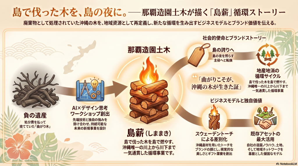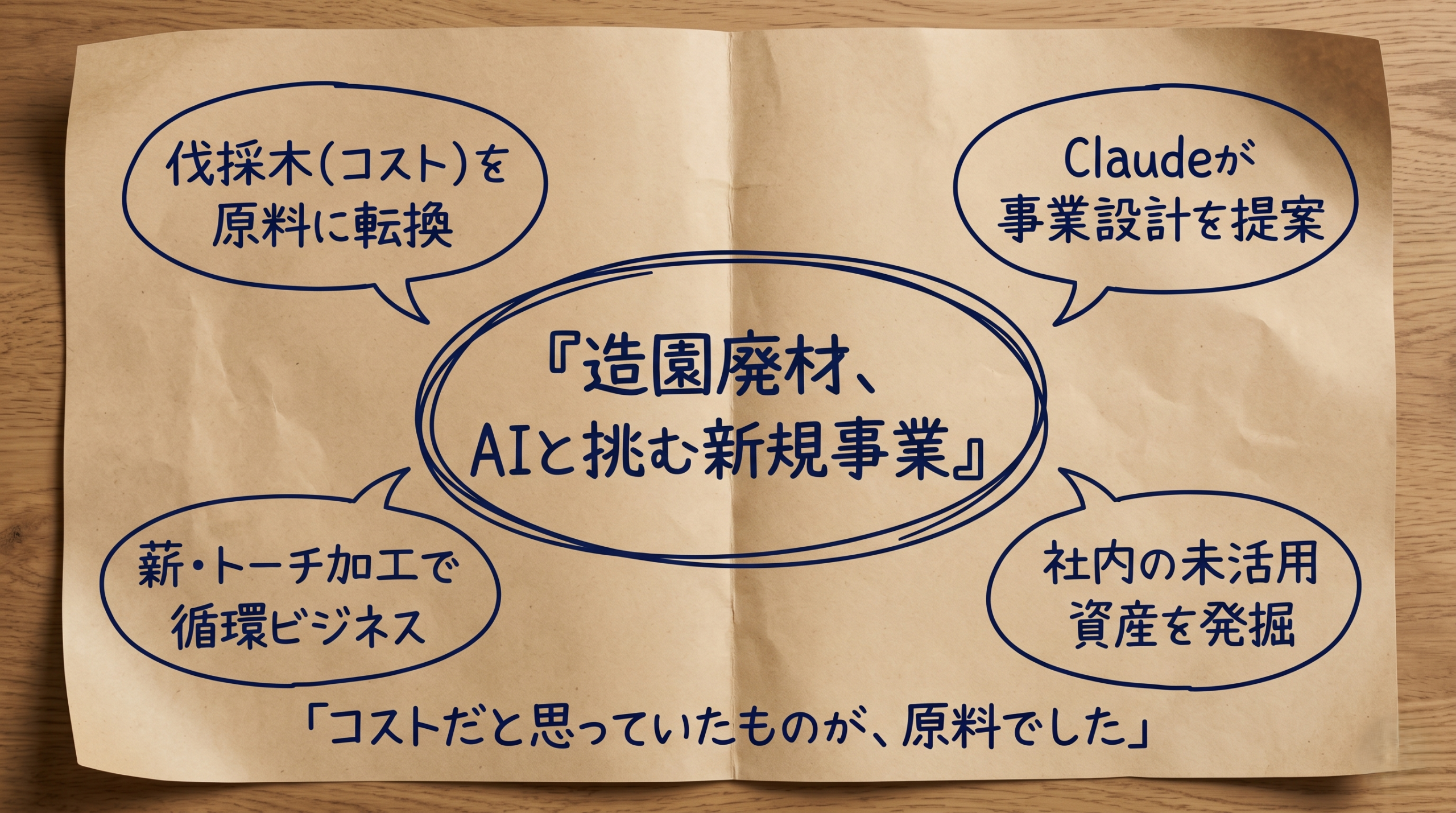 アトツギの前原さんが、画面を見ながら言いました。今回はみなと中小企業診断士事務所の「AI×デザイン思考」ビジネスアイデアワークショップの一環です。那覇造園土木の新規事業アイデアを、AIと一緒に設計しています。那覇造園土木では、伐採した木を年間500トン、処分会社にお金を払って引き取ってもらっています。これまでコストでしかなかったものが、事業の中心に化ける可能性が見えた瞬間でした。