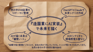 未来洞察ワークショップ:御社の資産・現場感覚・未来シナリオを素材に、AIと協働で事業アイデアを一枚の設計図にまとめます。