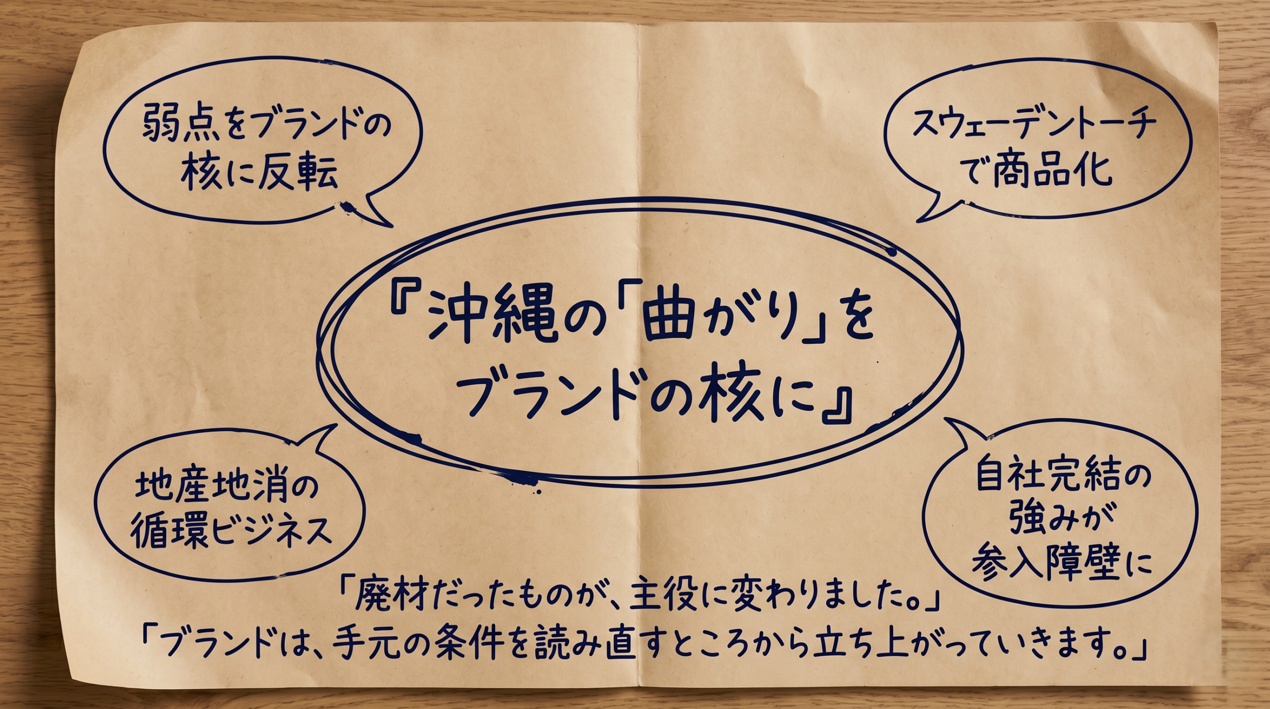 AI×デザイン思考ワークショップの中で、Claudeはこの条件を逆側から読み直しました。「曲がりこそが沖縄の木が生きた証」。弱点とされてきたものが、他では真似できないブランドの核に反転していきます。同じ木を、同じ量だけ切っているのに、添える物語が変わるだけで商品が変わりました。