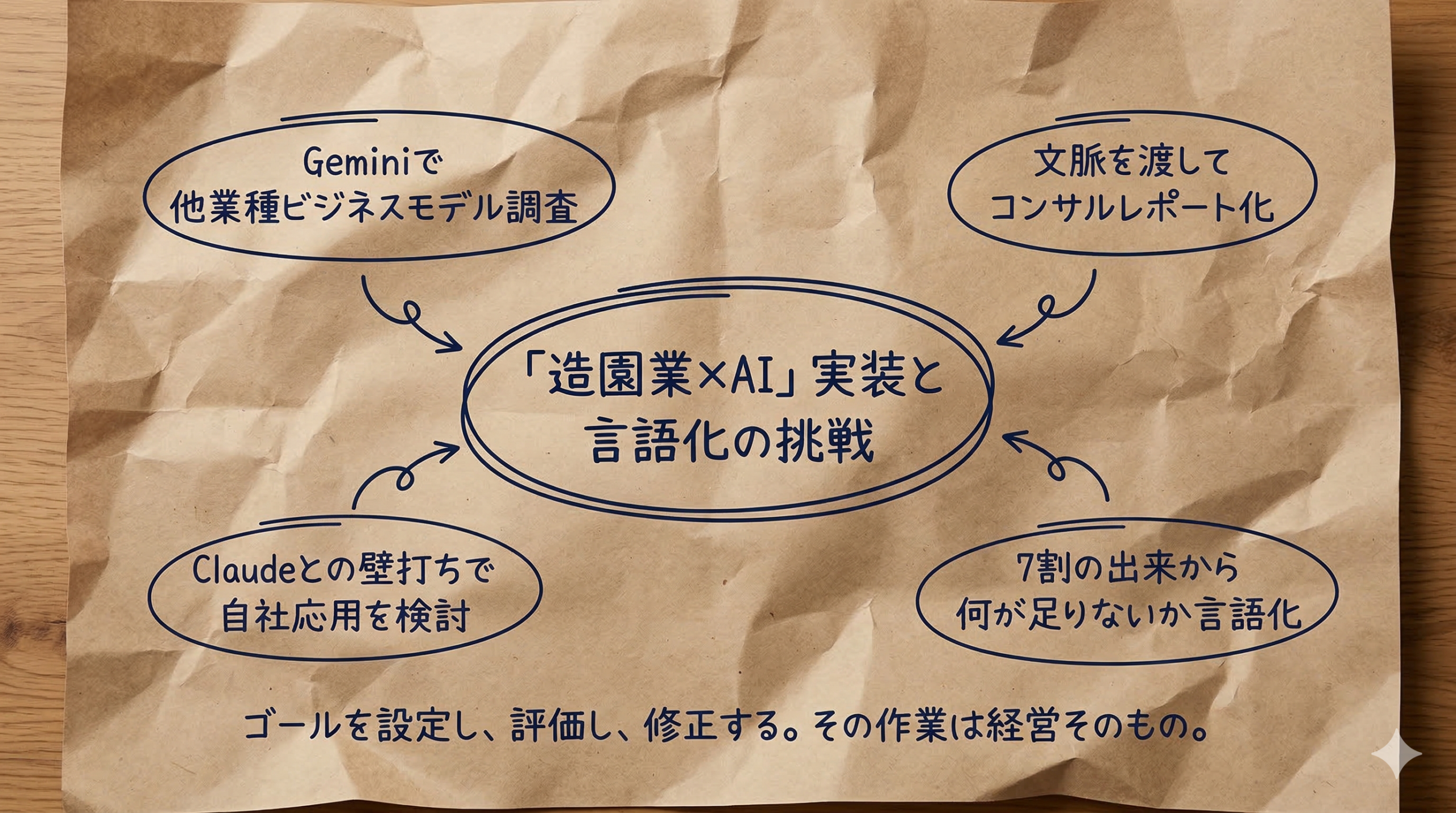 出てきた内容が浅ければ、そのまま受け入れる必要はありません。業界と関係のないトレンドワードが並ぶようであれば、まずビジネスモデルの深掘りに立ち返ります。深掘りが十分にできたと確認してから、今度はClaude等に投げて自社への応用を壁打ちする。最初から完成品を期待するのではなく、7割の出来を前提にして、何が足りないかを言語化しながら磨いていくイメージです。