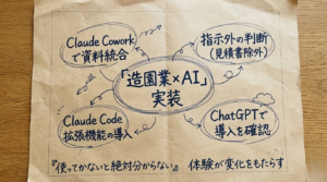 今日のセッションでは、見積もり自動化の仕組みをClaude Codeで構築するための設計図を描きました。現場で音声メモを残し、写真をBOXにアップする。会社に戻った時には、見積もり書の叩き台が出来上がっている。最終確認だけ人間がやり、承認すればそのまま送信できる。前原さんが描くのは、直行直帰できる現場の形です。